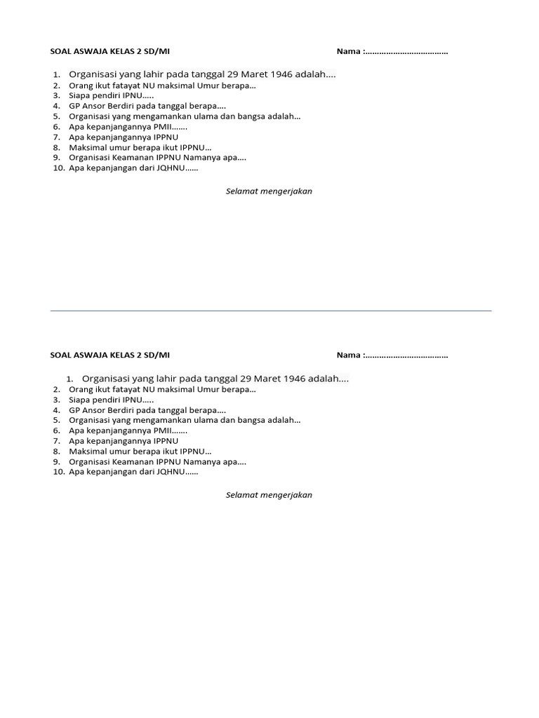 Berikut adalah kumpulan soal yang mencakup berbagai aspek materi Aswaja untuk kelas 5 MI semester 2. Siswa diharapkan dapat memahami konsep dan menerapkan nilai-nilai yang terkandung di dalamnya.