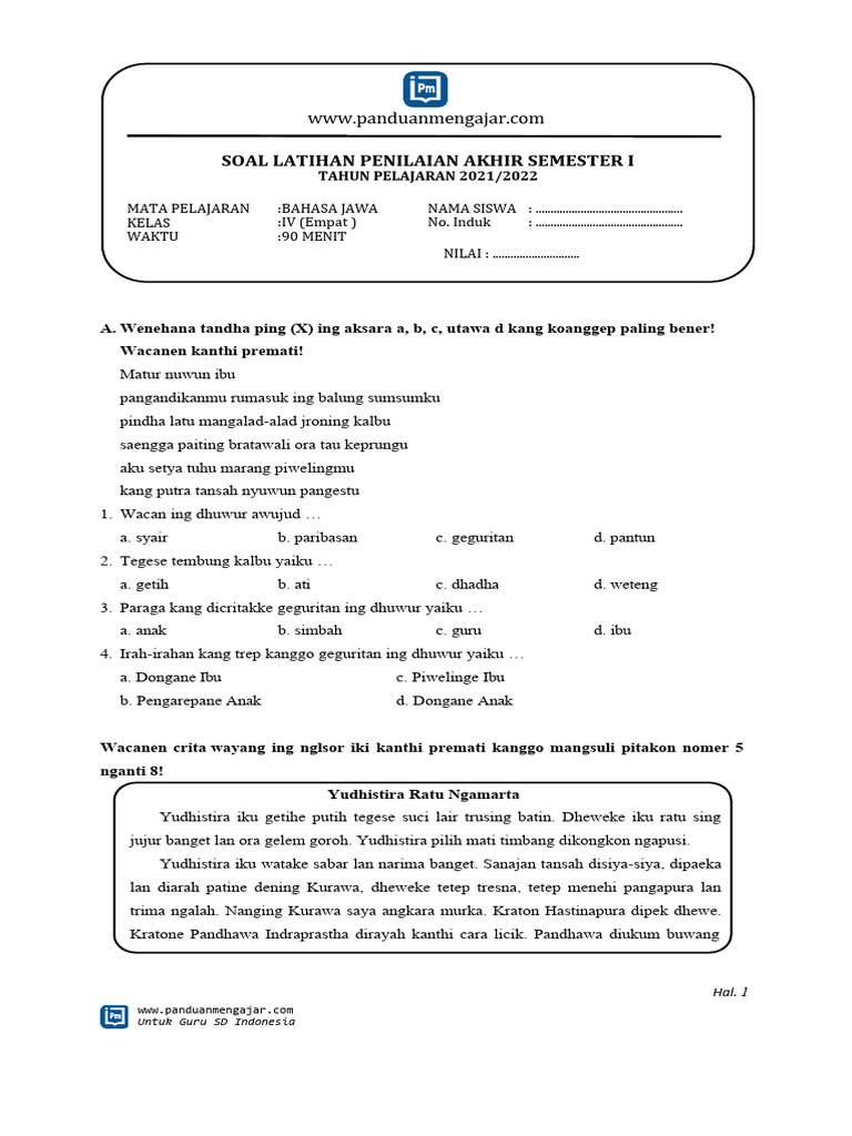 Soal Bahasa Jawa kelas 4 semester 2 dalam format PDF adalah alat yang sangat berharga dalam proses pembelajaran. Materi yang diujikan mencakup aspek krusial seperti unggah-ungguh basa, aksara Jawa, tembang, paribasan, dan pemahaman cerita, yang semuanya fundamental untuk melestarikan dan menguasai Bahasa Jawa. Dengan memanfaatkan kemudahan akses dan portabilitas format PDF, serta menerapkan strategi belajar yang efektif dan dukungan penuh dari guru serta orang tua, siswa dapat mencapai penguasaan Bahasa Jawa yang optimal. Pada akhirnya, ini bukan hanya tentang nilai di rapor, melainkan tentang menanamkan kecintaan terhadap budaya dan bahasa ibu, sebagai bekal berharga bagi generasi penerus bangsa.